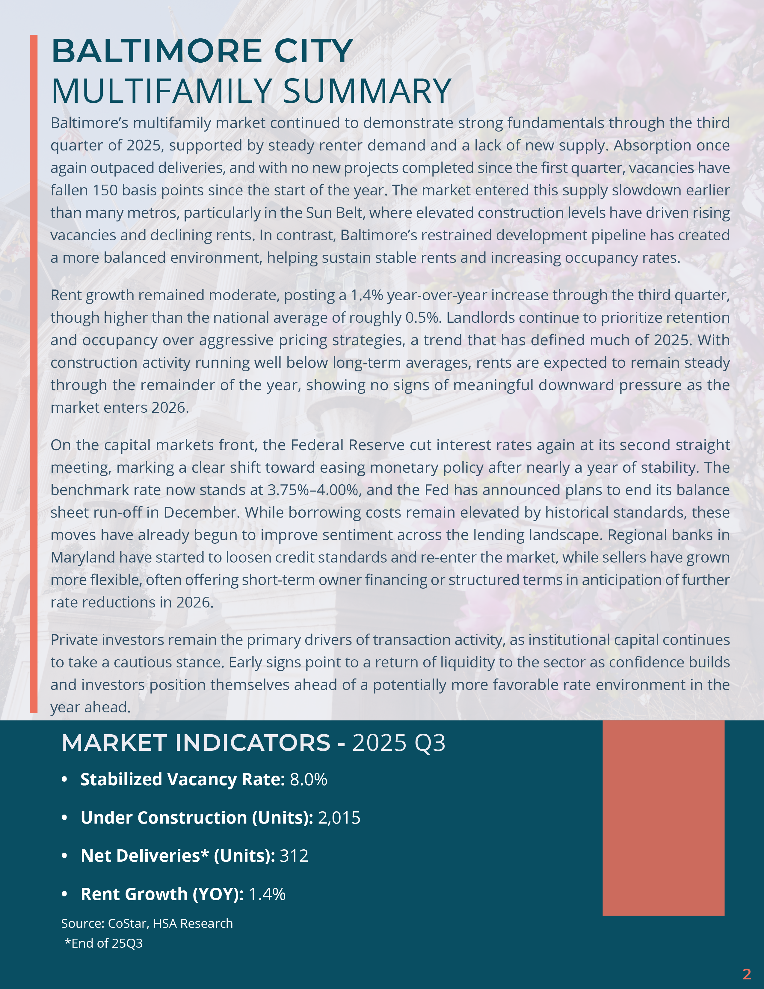 - Tightening Fundamentals: With no new completions since Q1 2025, absorption outpaced deliveries, driving vacancies down 150 basis points year-to-date and keeping Baltimore’s market balanced compared to oversupplied Sun Belt metros.